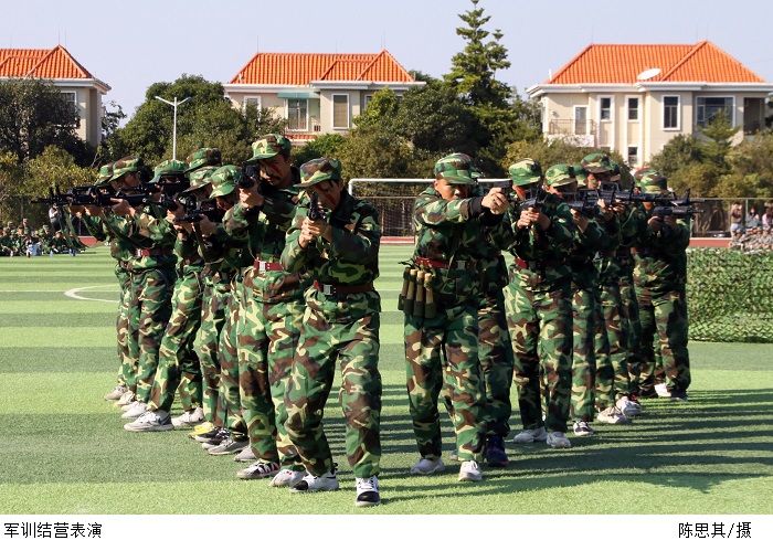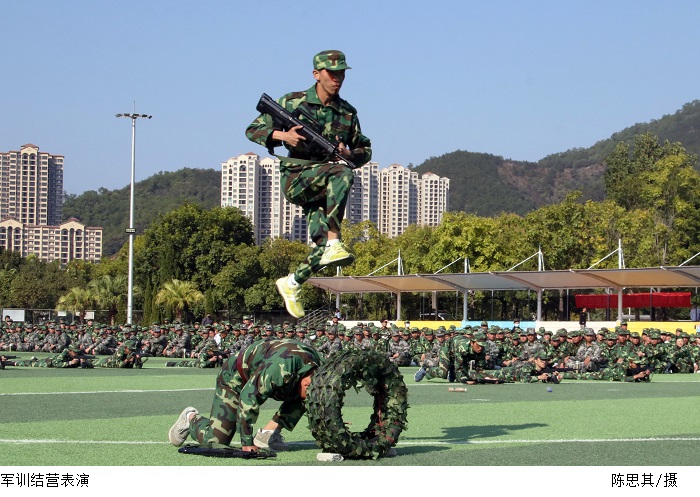 各团代表军训方阵迈着铿锵的步伐,动作整齐划一、英姿焕发。擒敌拳表演气势磅礴,一招一式尽显少年英气;匕首操表演英姿飒爽,一举一动饱含刚强自信;战术综合演练动作敏捷、灵活多变。