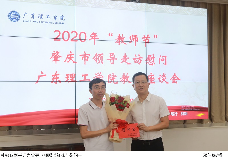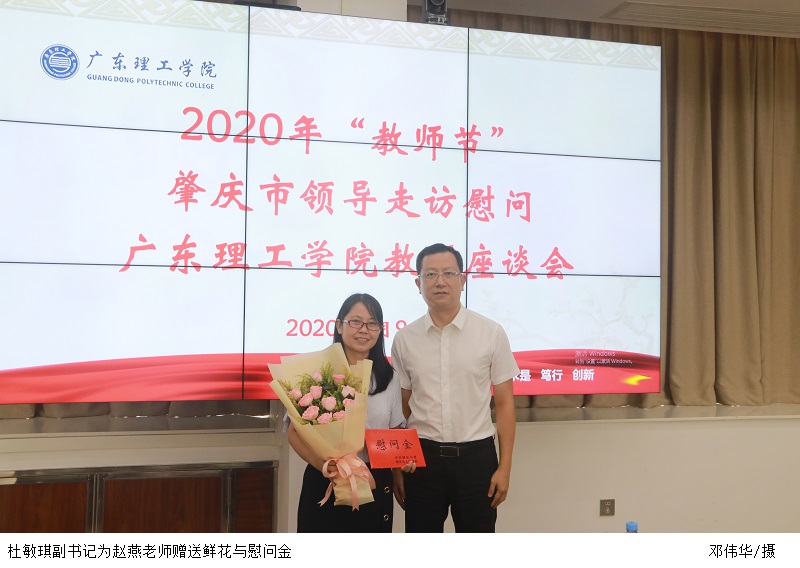 座谈会上,市委杜敏琪副书记首先向获得“肇庆市优秀教师”称号的会计学院赵燕副院长和获得“肇庆市师德标兵”称号的基础教学部曾亮主任赠送鲜花和慰问金,并致以节日的问候。