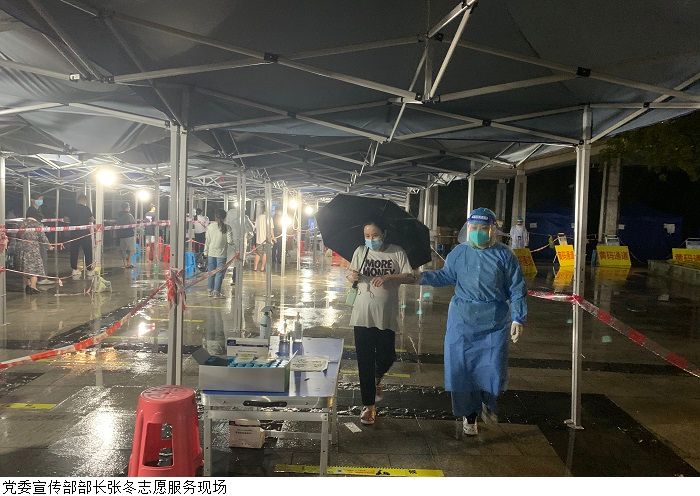 11月20日,学生处教师詹庆文主动申请成为防疫志愿者,之后迅速投入工作,负责东门广场核酸检测秩序维持、查验红黄码等协助工作。“我白天需要居家办公,晚上就一直在这里协助医务人员,按安排我会一直服务到这个月27号。”
