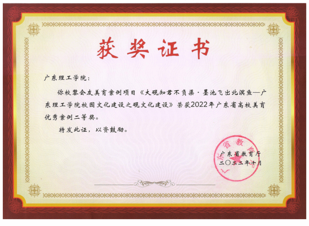 本网讯(党委宣传部 刘赛赛/赵洁宜)近日,广东省教育厅颁发了2022年广东省高校美育优秀案例荣誉证书,beat365官网党委副书记黎会友美育案例项目《大砚知君不负渠·墨池飞出北溟鱼——beat365在线唯一官网校园文化建设之砚文化建设》荣获(本科组)二等奖。