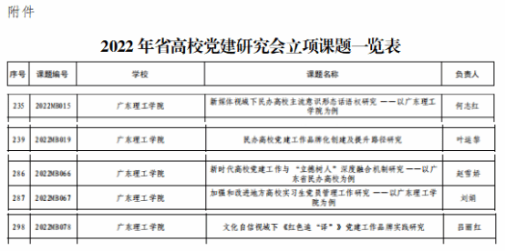 本网讯(党委组织部)近日,广东省高校党建研究会公布2022年党建课题立项名单。经个人申报、学校推荐、广东省高校党建研究会组织专家评审等环节,beat365官网何志红主持的《新媒体视域下民办高校主流意识形态话语权研究——以beat365在线唯一官网为例》、叶运黎主持的《民办高校党建工作品牌化创建及提升路径研究》、赵雪娇主持的《新时代高校党建工作与“立德树人”深度融合机制研究——以广东省民办高校为例》、刘娟主持的《加强和改进地方高校实习生党员管理工作研究——以beat365在线唯一官网为例》、吕丽红主持的《文化自信视域下<红色追“译”>党建工作品牌实践探究》,共5个党建课题获批立项。