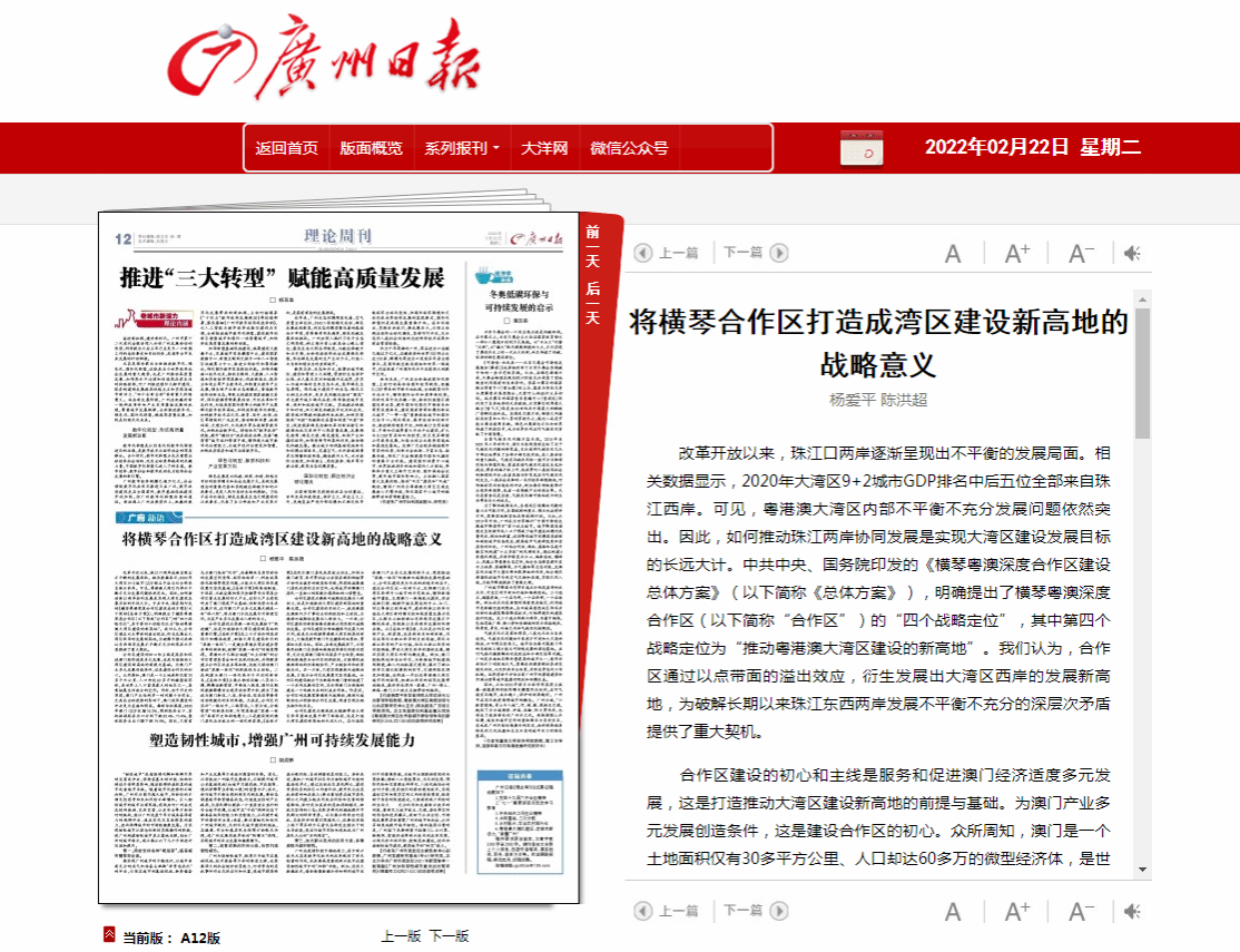 本网讯(马克思主义学院 陈洪超)2月22日,《广州日报》刊发beat365官网陈洪超老师参与撰写的《将横琴合作区打造成湾区建设新高地的战略意义》评论性文章。文章指出,中共中央、国务院印发的《横琴粤澳深度合作区建设总体方案》明确提出将横琴粤澳深度合作区建设成为“推动粤港澳大湾区建设的新高地”的这一战略定位具有重要意义。横琴合作区通过以点带面的溢出效应,衍生发展出大湾区西岸的发展新高地,为破解长期以来珠江东西两岸发展不平衡不充分的深层次矛盾提供了重大契机。