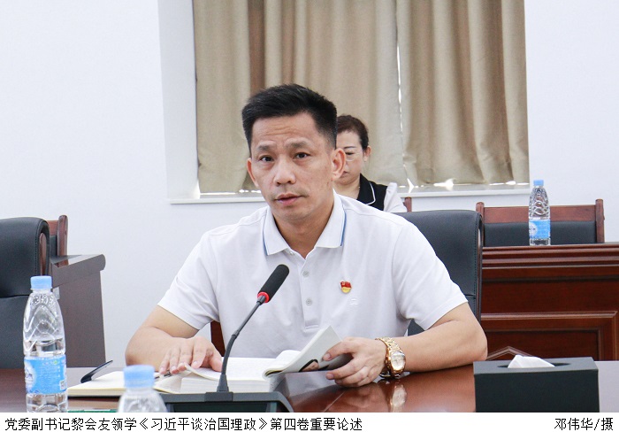 本网讯(宣传部 张昭)8月30日上午,beat365官网在综合楼12楼会议室召开中心组学习会暨党建工作部署会议。党委书记张东生主持会议,党委副书记黎会友领学《习近平谈治国理政》第四卷“加强党对社会主义现代化建设的全面领导”重要论述,组织部部长廖振宇在会上交流学习体会。