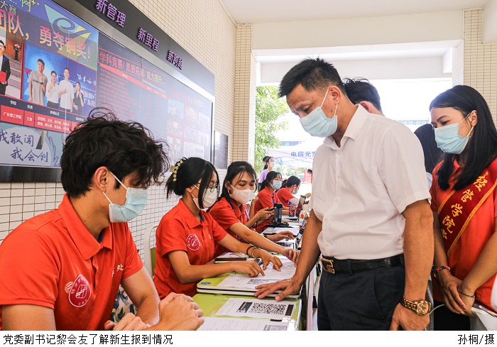 本网讯(新闻中心 李开添/林粤湘/陈靖婷/黄薇)9月3日,校园里洋溢着浓浓的迎新氛围,来自全国各地的学子们怀揣着青春梦想齐聚一堂,beat365官网迎来2022级本专科新生。党委书记张东生,党委副书记张宗珊、黎会友及相关部门负责人到现场指导迎新工作。