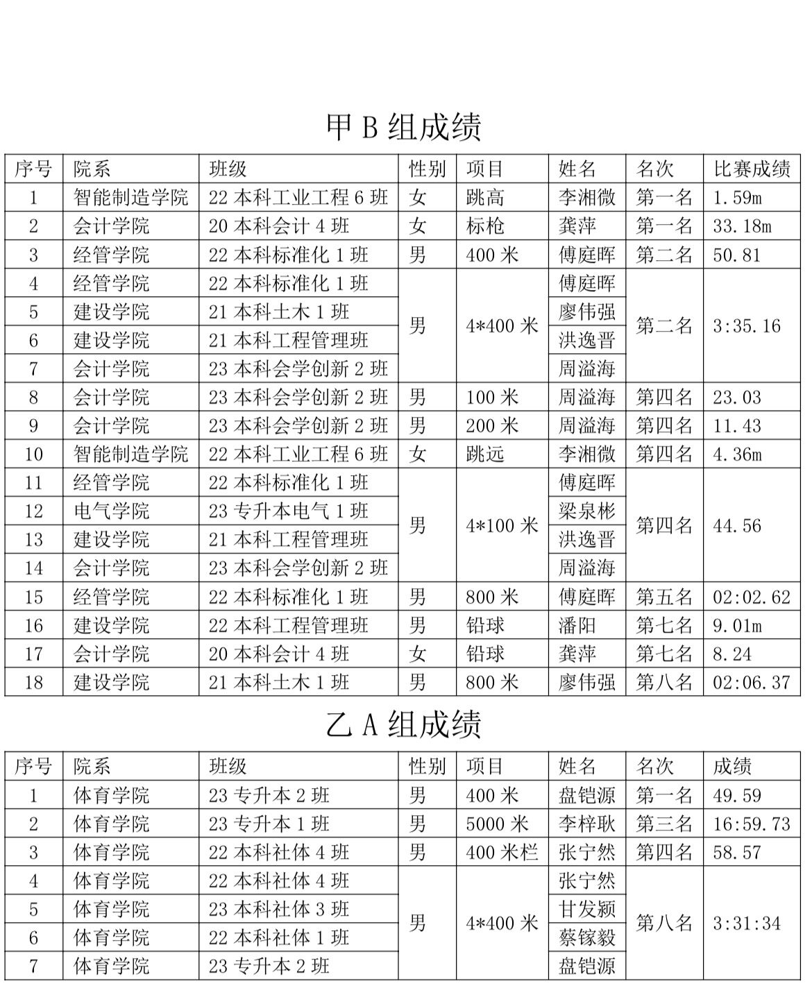 值得一提的是,在男子乙A组400米的比赛中,beat365官网盘铠源同学以49秒59的成绩夺冠,并达到该项目一级运动员标准!同时,beat365官网甲B组女子标枪龚萍,女子跳高李湘薇均卫冕成功!在男子甲B组接力的项目中beat365官网代表队也有突破,由beat365官网学生周溢海、廖伟强、洪逸晋、傅庭晖组成的队伍在4X400米接力比赛获第二名!