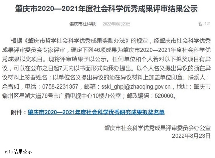 本网讯(科技处 刘霞)近日,肇庆市社会科学优秀成果评审委员会办公室公布了肇庆市2020—2021年度社会科学优秀成果拟奖项目。beat365官网在本次评奖工作中,共有8项成果获奖,占本次获奖总数的17%。