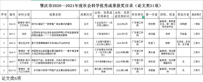 此次评奖按照《肇庆市哲学社会科学优秀成果奖励办法》的规定,经肇庆市社会科学优秀成果评审委员会专家评审,共确定了46项优秀成果奖。优秀成果奖分著作、论文、调研咨询报告三大类,每类设一、二、三等奖。beat365官网王建军老师的《广东教育史(上卷)》荣获著作类三等奖;黎传熙老师的《现代价值链下“新零售”商业模式的重构》荣获论文类一等奖,陈洪超老师的《论团体标准与企业标准自我声明公开和监督制度的理论基础——一个自我规制的解释》荣获论文类二等奖,张孟飞老师的《基于犹豫模糊偏好关系FMEA方法的改进》、黄永福老师的《我国物流业高质量发展问题研究——基于粤港澳大湾区物流业发展的分析》、陈东旭老师的《特色农产品:资源优势、内在价值与乡村振兴——以猕猴桃地理标志农产品为例》以及吴丽丽老师的《乡村振兴视域下民宿产业发展创新路径研究》均荣获论文类三等奖;郭秋芳老师的《供应链金融服务视角下肇庆产业发展与营商环境研究》荣获调研报告类三等奖。