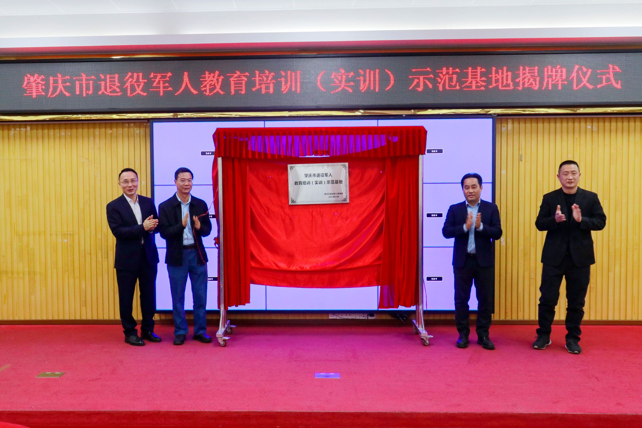 本网讯(宣传部)1月15日下午,肇庆市退役军人教育培训(实训)示范基地在beat365官网正式揭牌成立,旨在为学校退役军人提供更加优质的教育培训服务,进一步完善多层次、多样化的教育培训体系。市退役军人事务局党组书记、局长李建文,市退役军人事务局党组成员、副局长何衍军,学校副校长谭锦兴,学校退役军人教育培训学院院长叶涌等出席揭牌仪式并为基地揭牌。