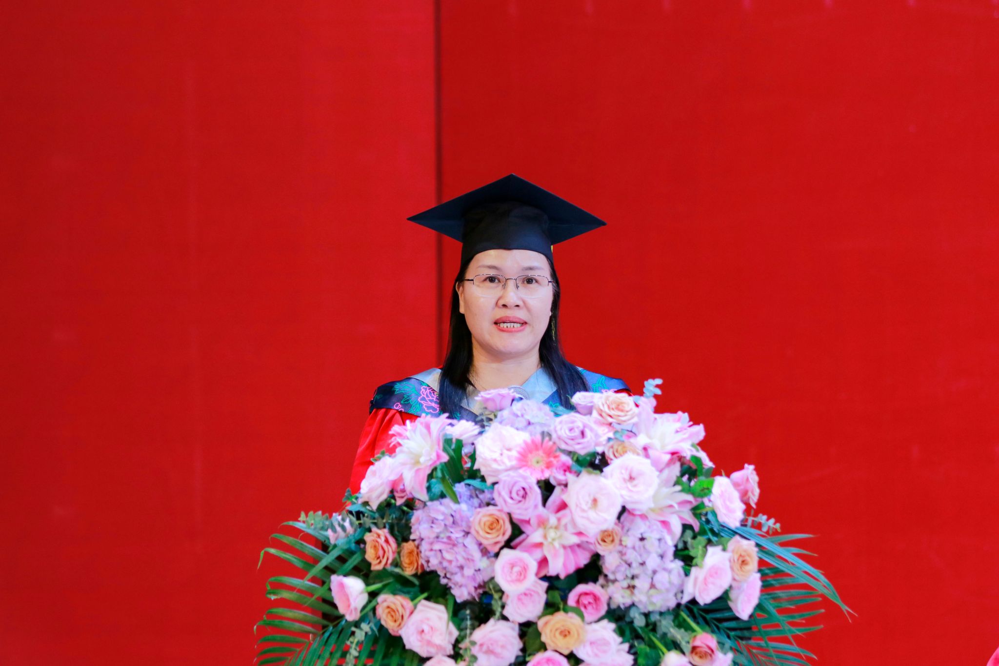 教师代表、会计学院盛洁教授代表全体教师向全体毕业生送上祝福。她叮嘱同学们要持续学习、诚实守信、快乐生活,希望同学们一往无前、初心不改,乘风破浪、与光同行。