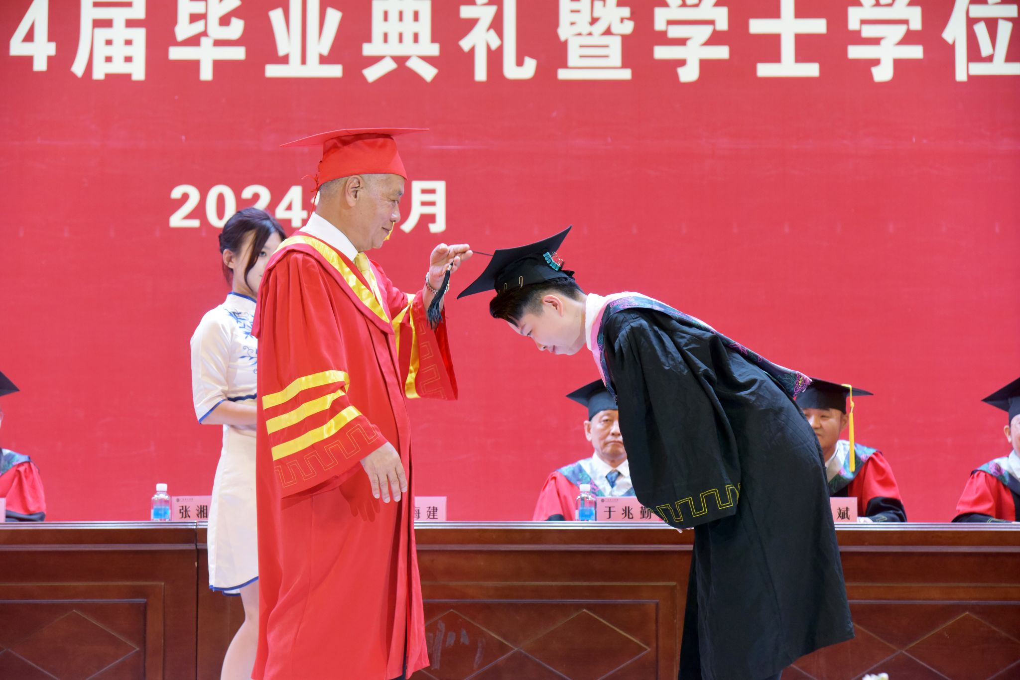 张湘伟为获得学士学位的学生代表颁授学位证书、为其拨穗正冠,并合影留念。