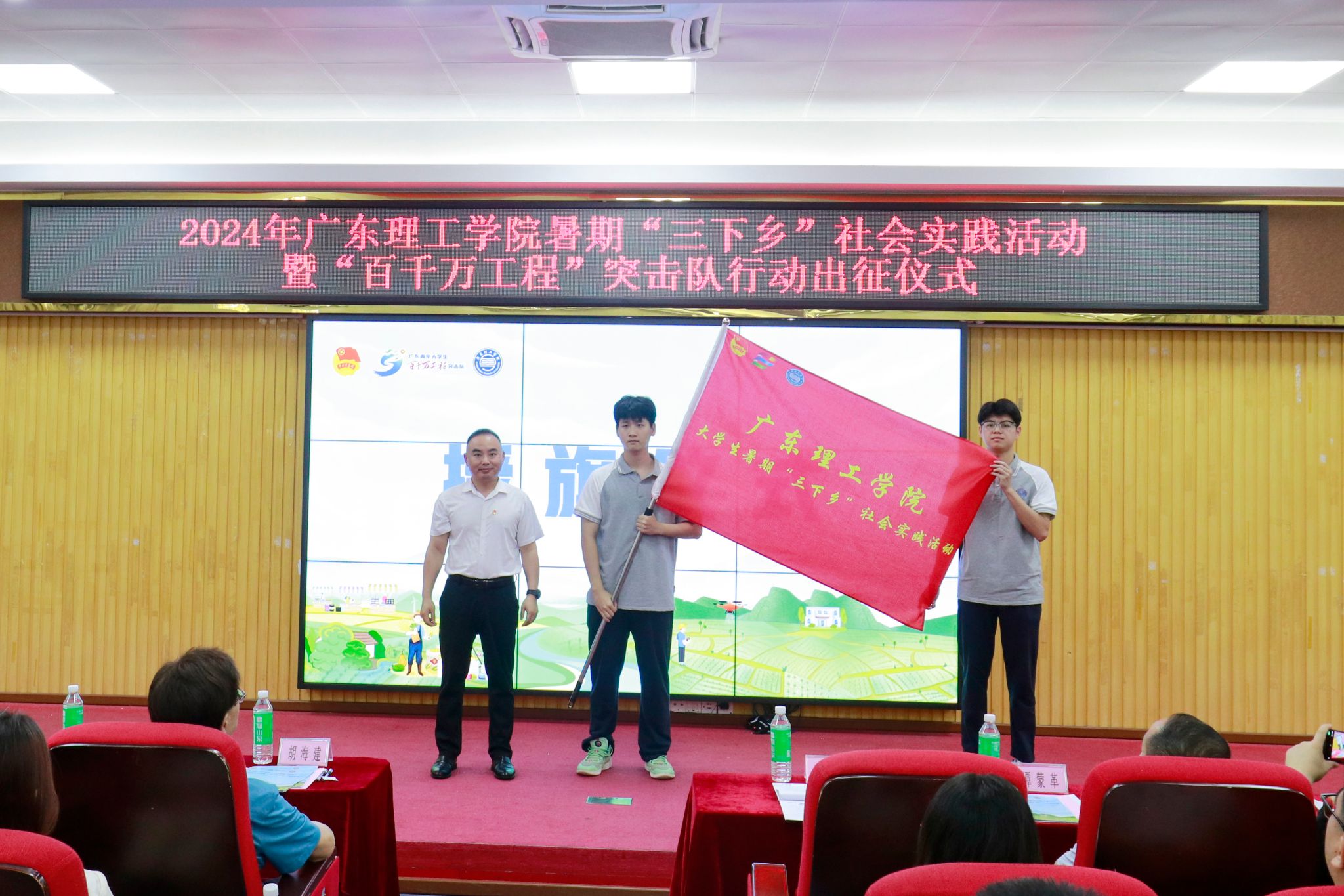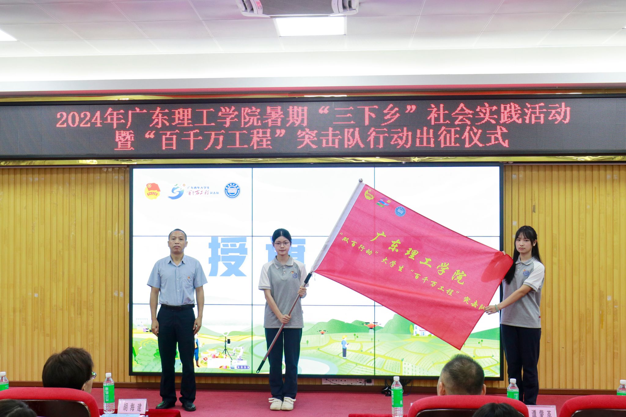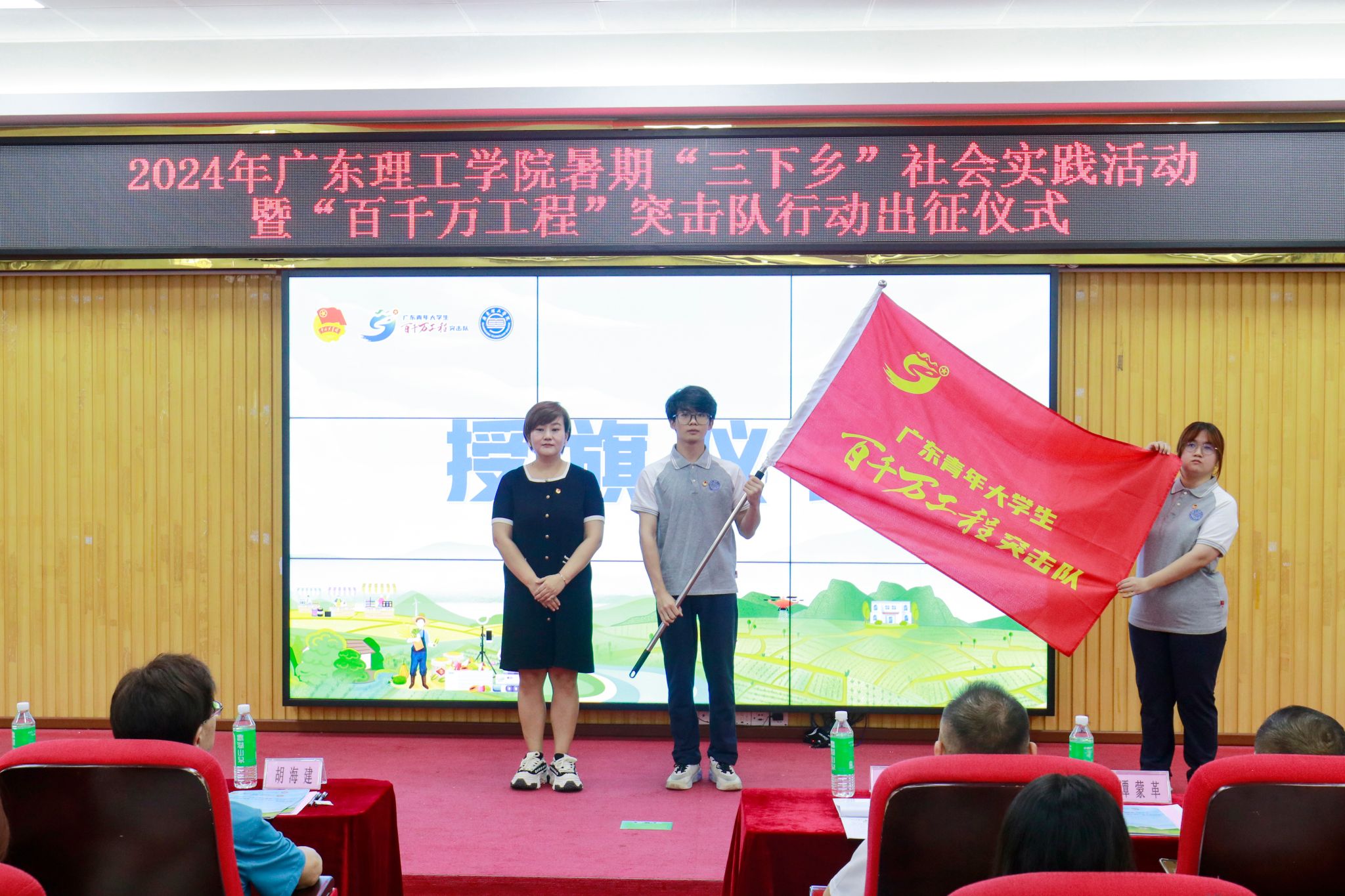 授旗仪式上,廖振宇、张冬、谭蒙革分别为突击队代表授“beat365在线唯一官网大学生暑期‘三下乡’社会实践活动”总旗、“广东青年大学生‘百千万工程’突击队”旗帜及“双百行动”活动总旗。