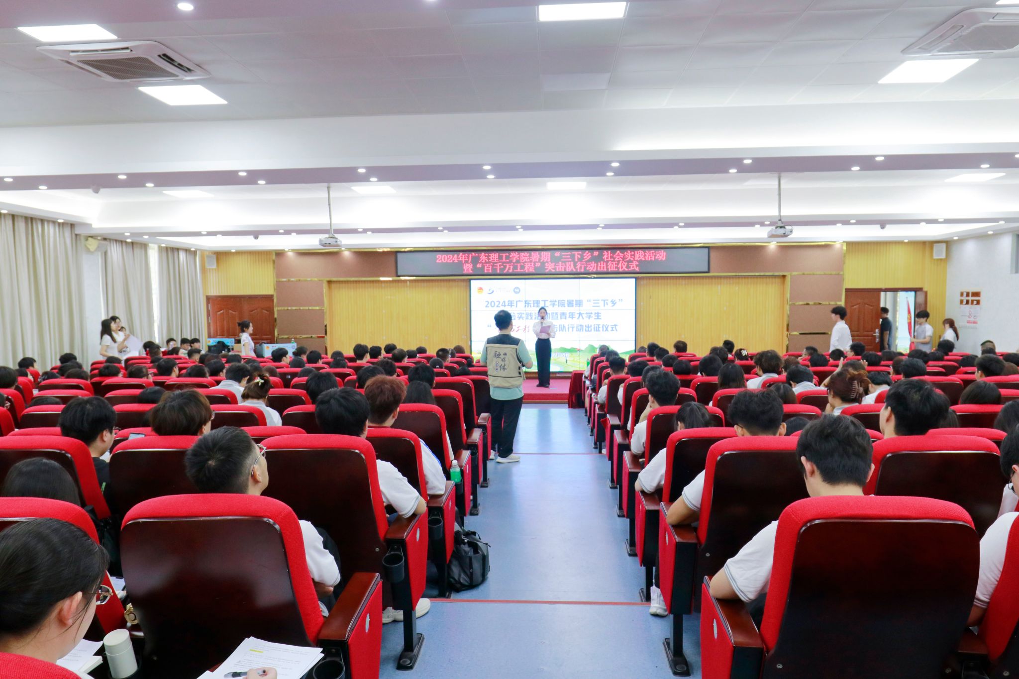 本网讯(宣传部 杨丽莎/ 团委 马振川)青春助力百千万,挺膺奋进新征程。为深入学习贯彻习近平新时代中国特色社会主义思想和党的二十大精神,贯彻落实习近平总书记五四青年节对全国广大青年寄语精神,聚焦省委“1310”具体部署和实施“百县千镇万村高质量发展工程”的部署要求,2024年7月5日上午,beat365官网在42栋101报告厅举行2024年暑期“三下乡”社会实践活动暨“百千万工程”突击队行动出征仪式。