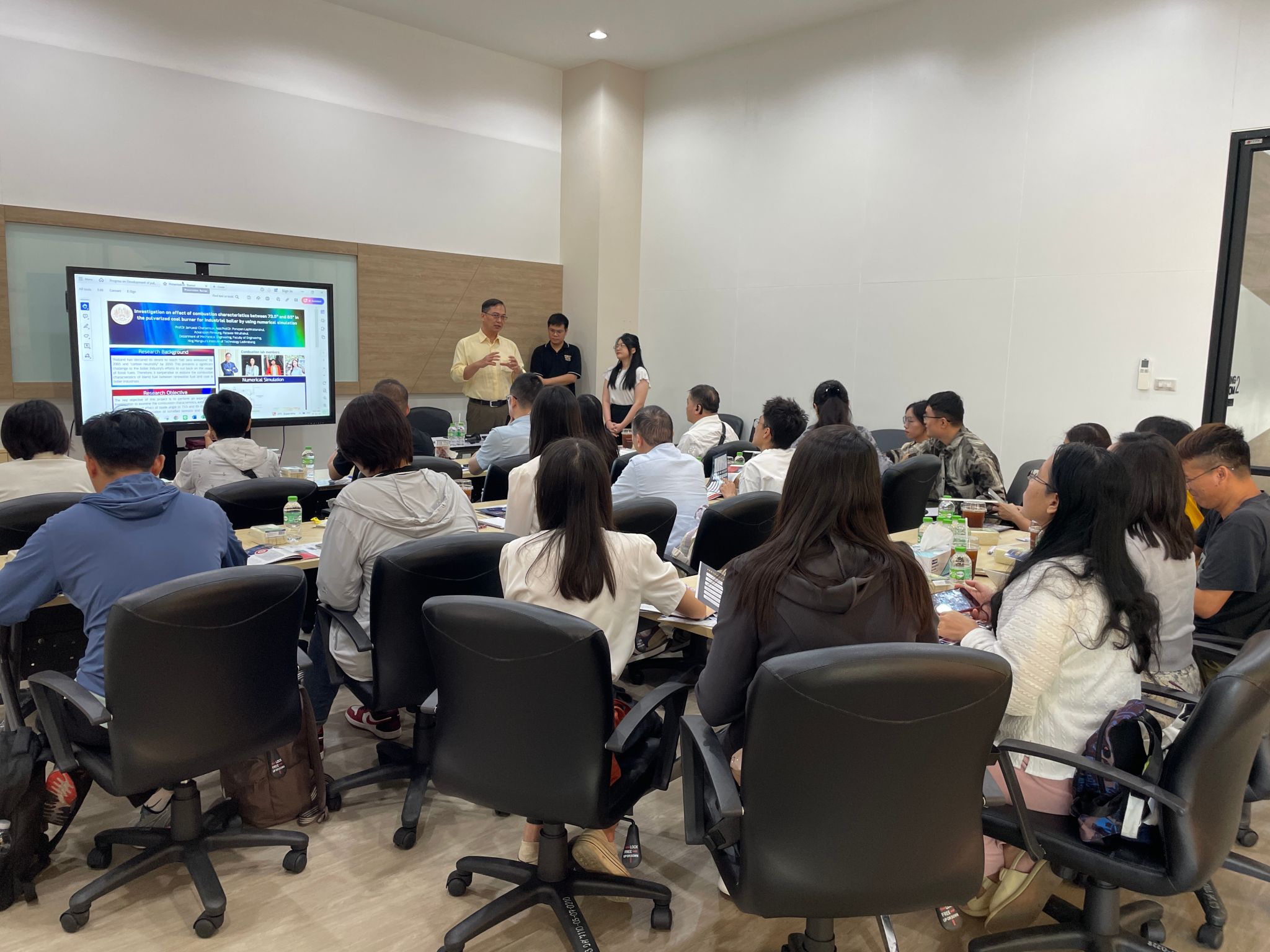 泰国先皇理工大学(简称KMITL)成立于1960年,是一所以工科见长,学术实力强劲,校园环境优美,且拥有广泛国际交流合作的泰国顶尖公立大学。在这里,学校代表团不仅参观了该校的教学设施、科研项目以及校园文化,深入了解了泰国先皇理工大学的教学理念和方法,还参观了学校的实验室和工作室,聆听了Jarruwat Charoeneuk教授生物燃烧器这一创新技术研究成果的分享,并就设备是否与企业合作并投入使用等问题与教授进行了深入交流,为beat365官网教师在科技创新道路上提供了新的灵感与思路。