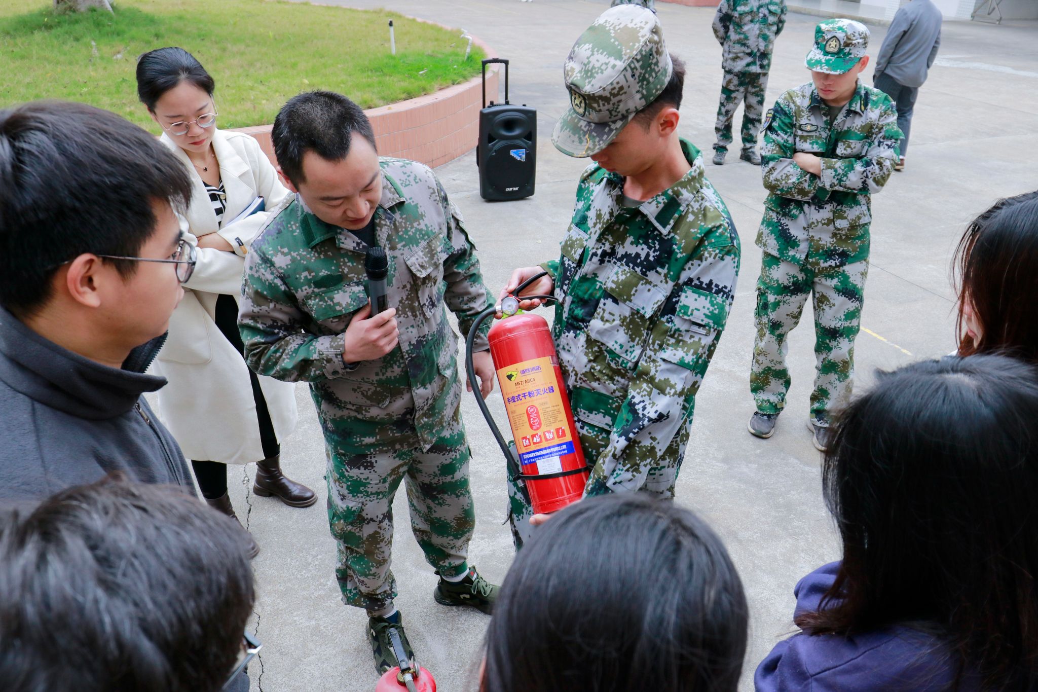 培训结束后,随着警报响起,消防演练正式开始。本次消防演练火灾场景设定在8号教学楼1至3楼楼梯间区域,听到警报后,全体师生迅速掩住口鼻,有序进行紧急疏散,快速撤离到疏散安置点。同时,灭火组到达现场,迅速开展灭火救援、设备保障等工作,并现场指导师生学习使用灭火器扑灭火源,掌握“提、拔、瞄、压”的规范操作。