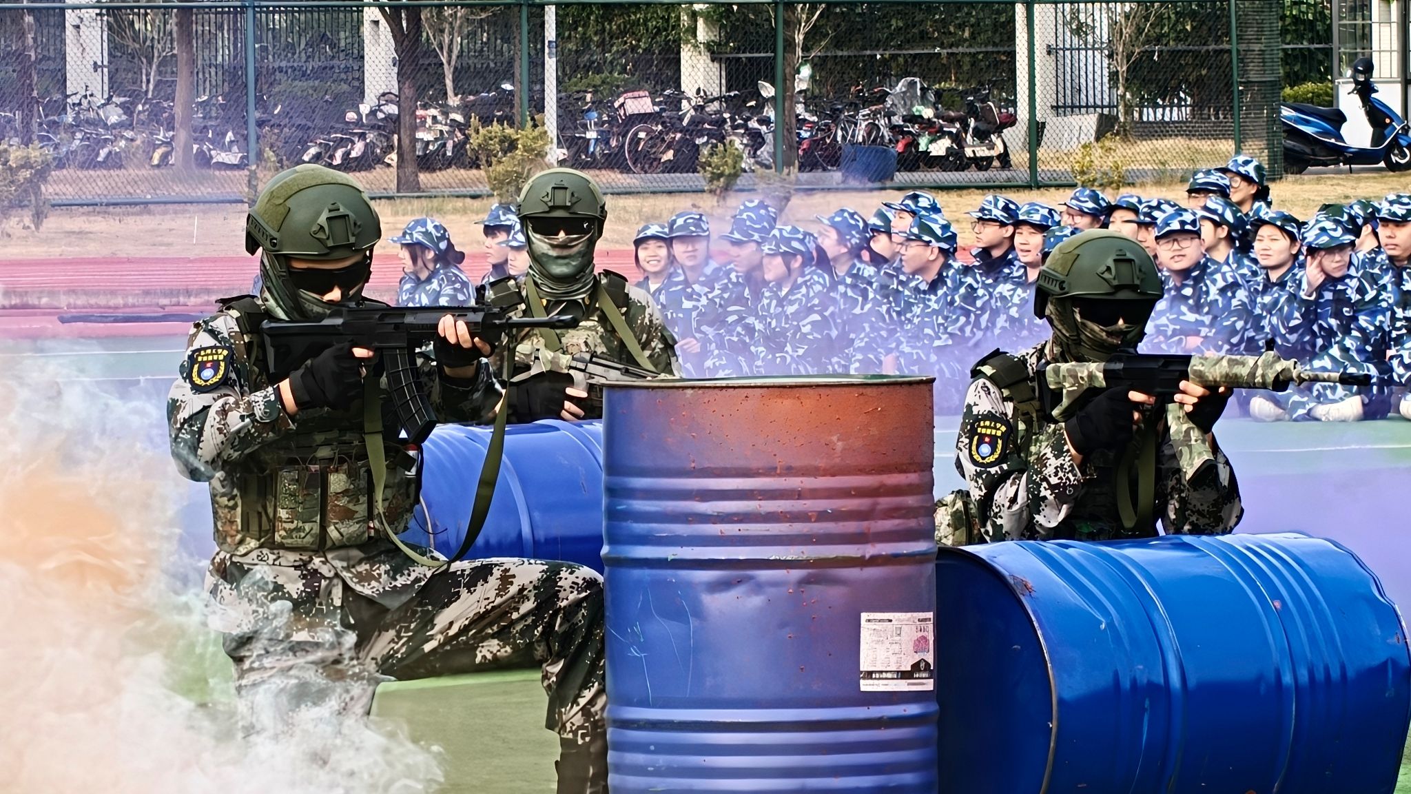 随后,军政教导队教官团进行队列示范、应急棍术、擒敌拳等一系列军事技能示范表演。