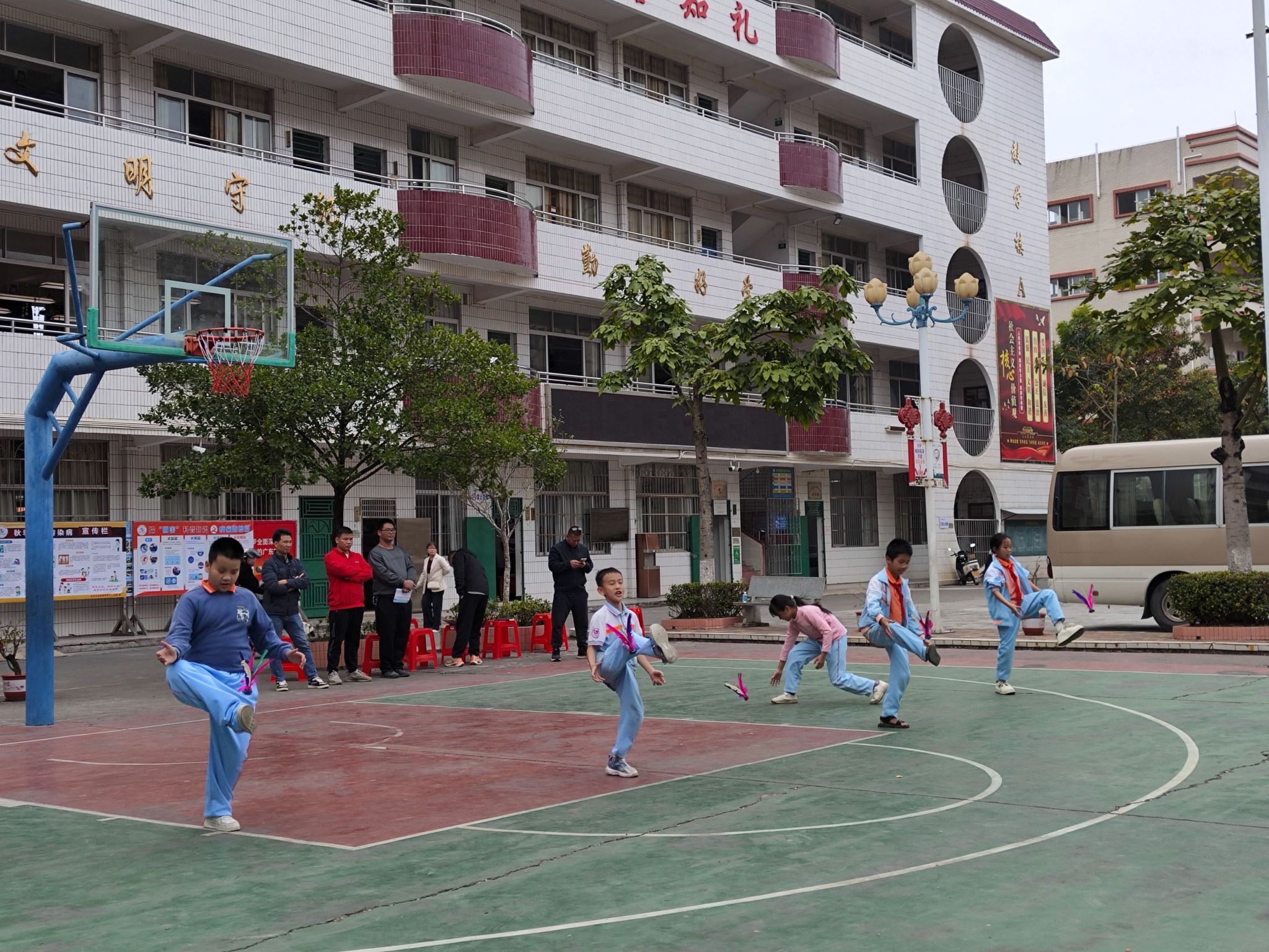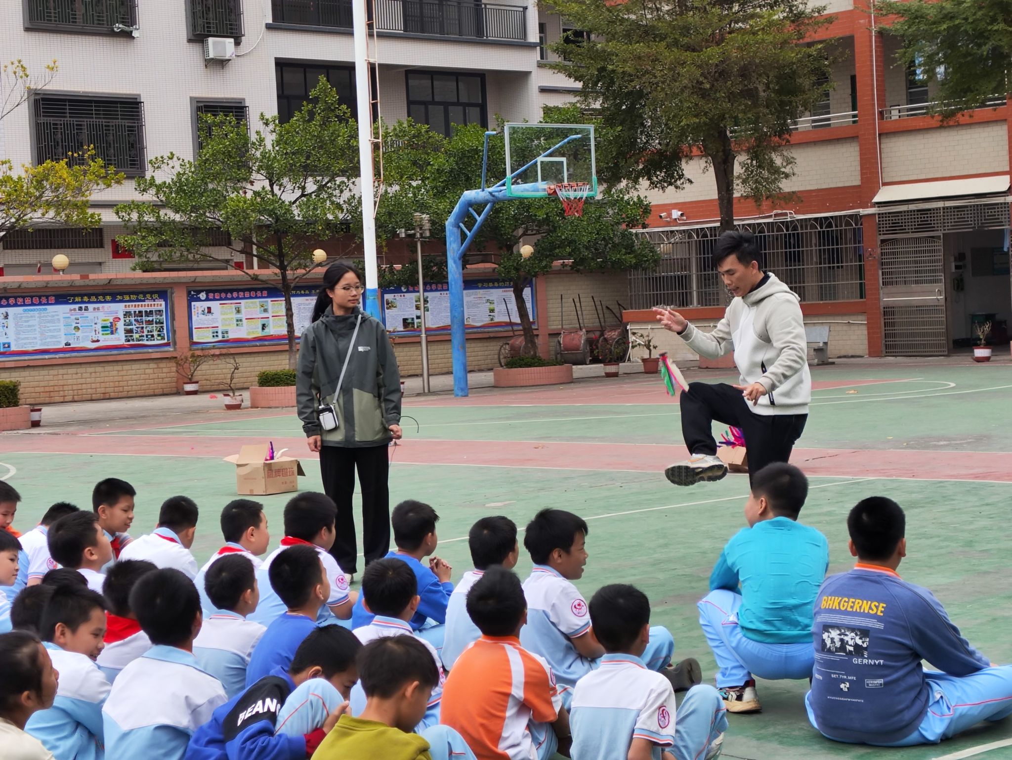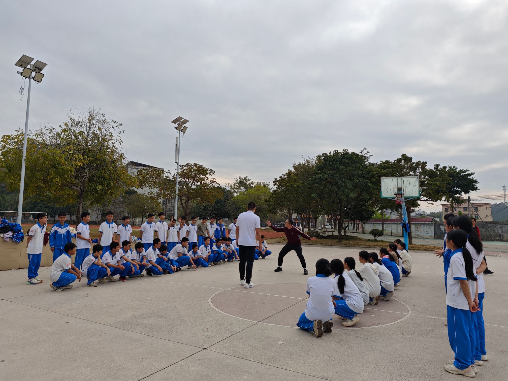 教研活动后,王安大川等体育教师在篮球场上为石板中学三个班级学生带来了趣味体育课堂,让学生们在互动游戏和团队竞赛中感受运动的乐趣、增强体质,激发了学生们的团队协作精神和体育竞技热情。