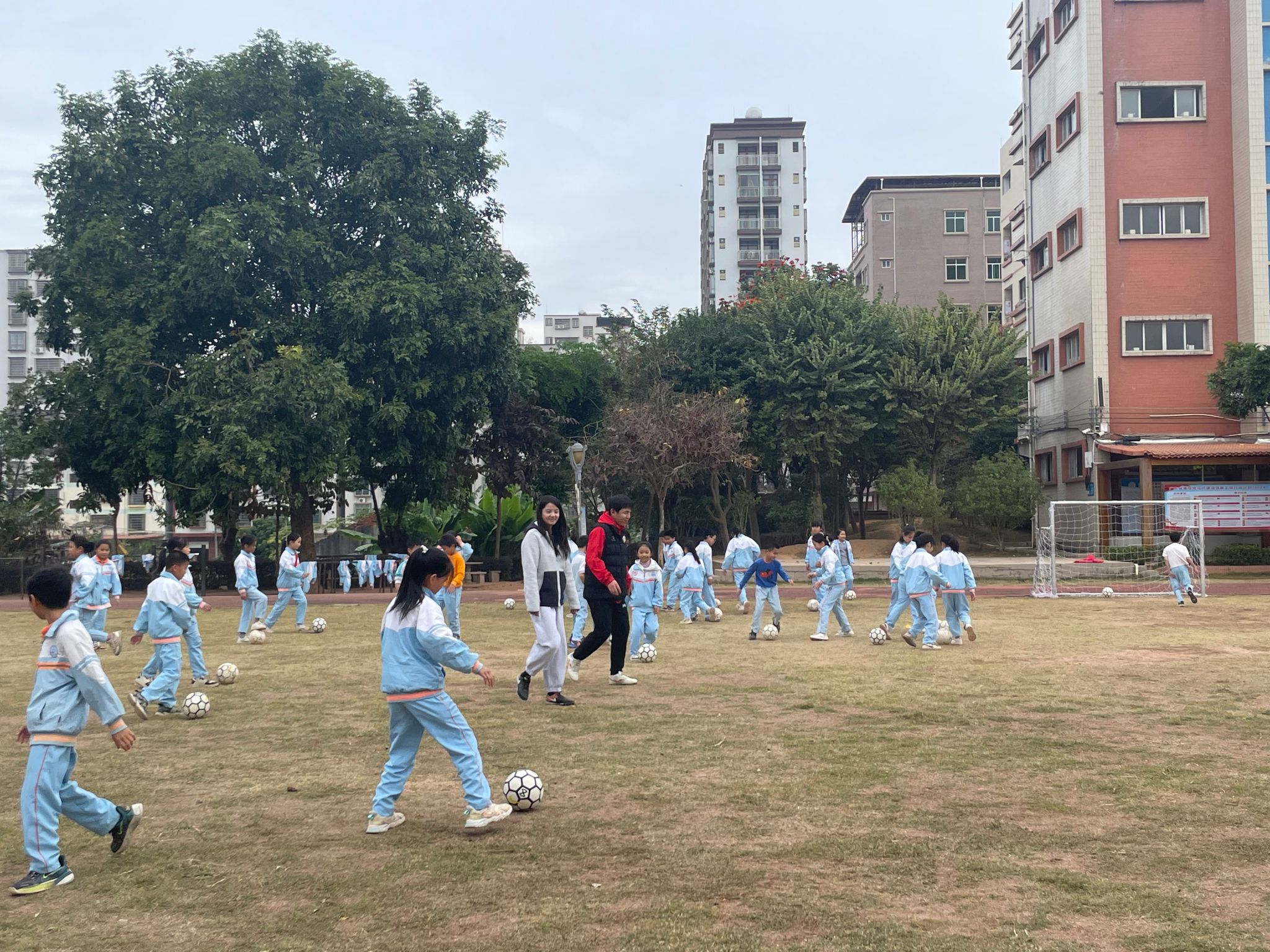 荷塘中心学校的足球场上,王爽和郑胜男老师带领四年级5班的孩子们上课,课前王老师细心地叮嘱孩子们将口袋里的钥匙、笔等尖锐物品交给老师保管,上课规范、技术到位,孩子们度过了一节欢乐与技术并行的足球训练课。
