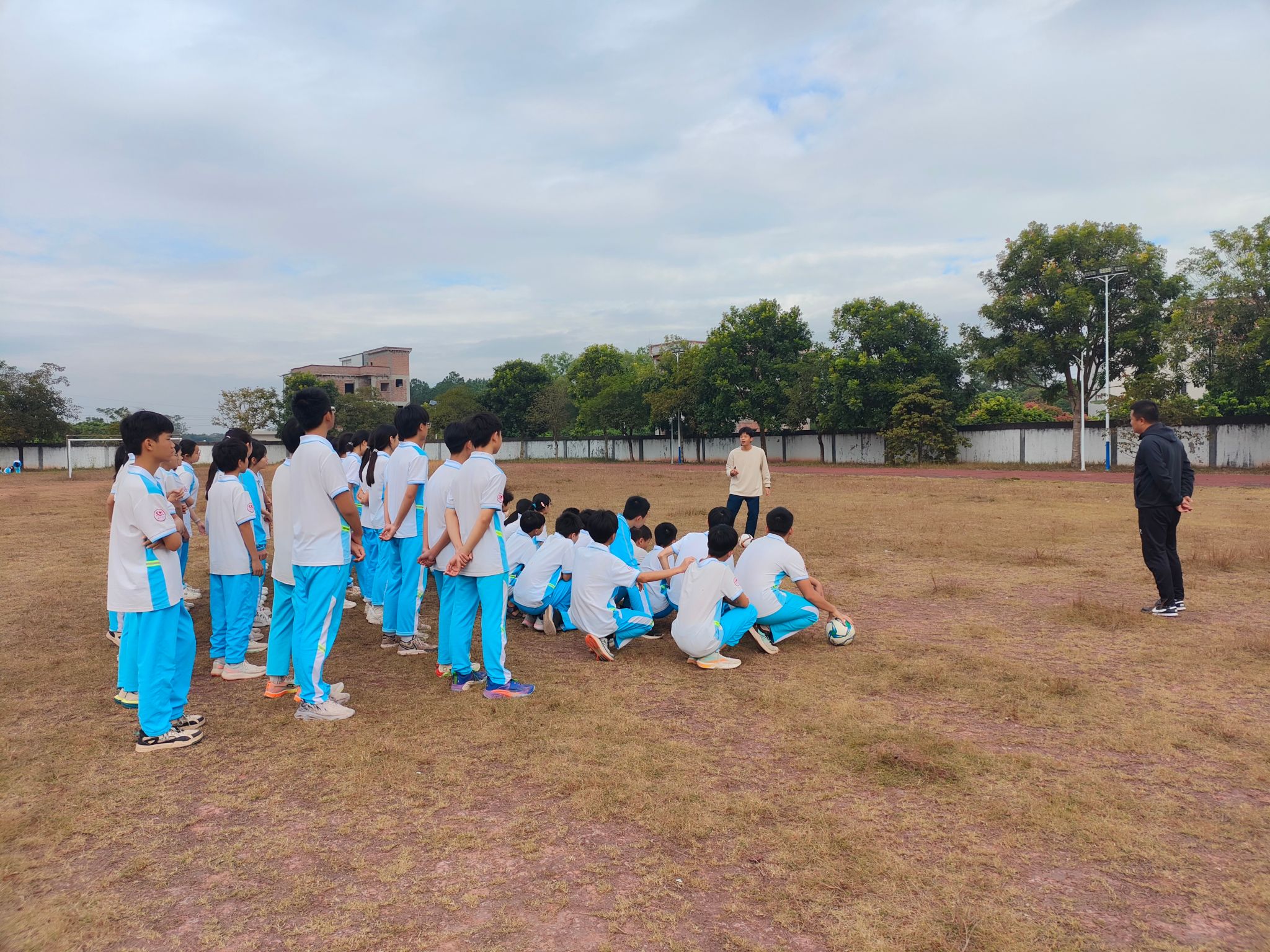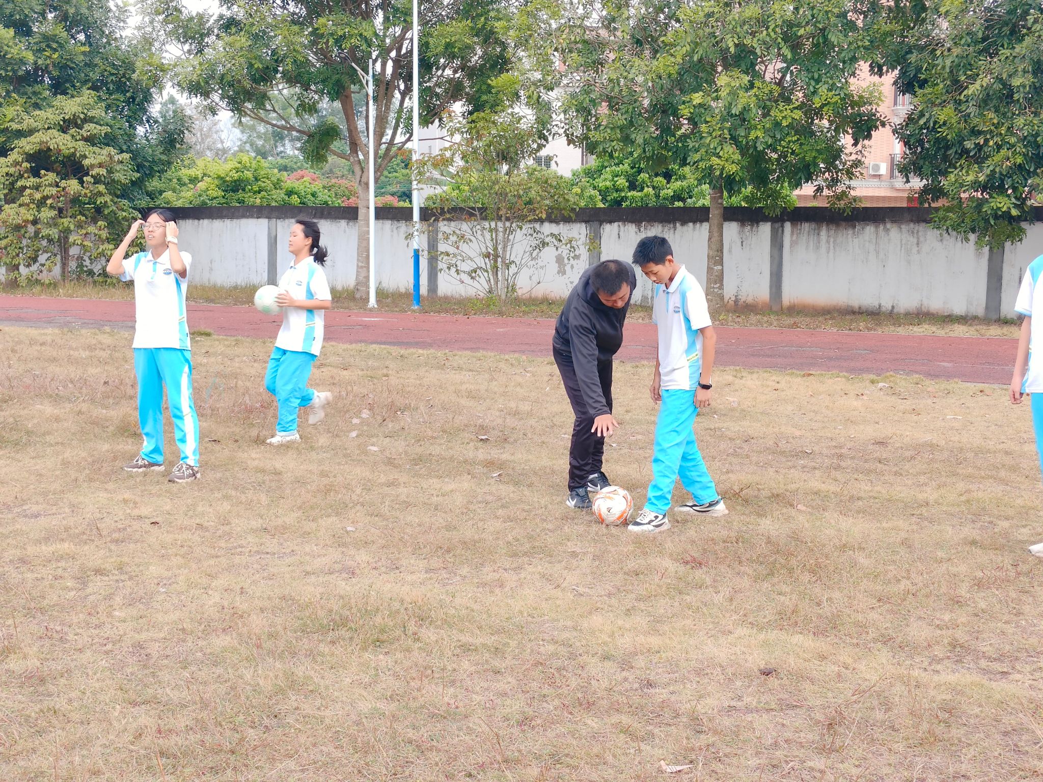 在荷塘中学,体育学院杨尚飞老师带领2022级社体专业陈家城同学耐心地向学生们传授足球技巧,从基本的传球、控球到射门动作,组织学生们进行分组练习,确保每个学生都能在实践中掌握所学知识。课堂既严谨又富有趣味,极大地激发了学生们对足球运动的兴趣,场上气氛热烈而有序。