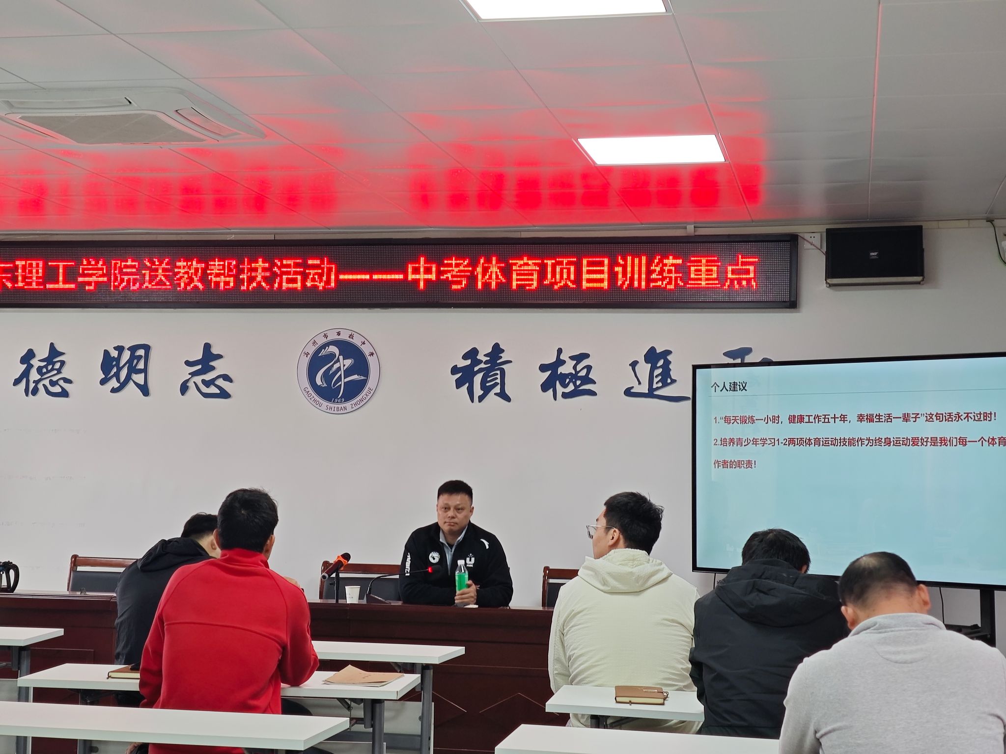 在石板中学会议室,体育学院罗源凯教授《中考体育项目训练重点》的讲座为石板中学、石板一中体育教研组老师们带来了体育教学与训练领域的丰富经验,他结合其他中学的成功案例深入浅出地阐述了中考体育项目的训练关键点。beat365官网体育学院7位老师与石板两所中学体育教研组教师齐聚一堂展开了积极的体育教学研究交流,共同探讨了体育教学领域所面临的诸多问题与挑战。