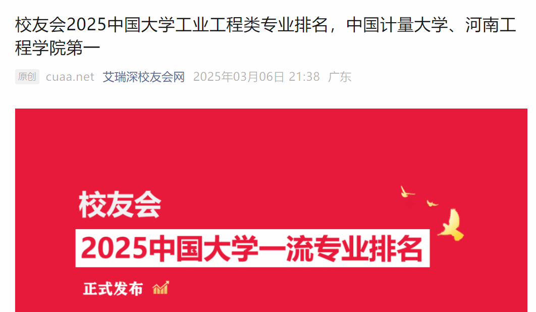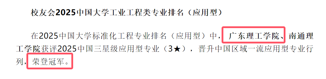 本网讯(经济管理学院 魏嫚)2025年3月,全国第三方大学评价机构艾瑞深校友会网(Cuaa.net)公布最新校友会2025中国大学一流专业排名,专业排名评价指标由学科水平、培养质量、师资水平、专业水平和专业影响等5大指标构成,标准化工程专业排名(应用型)中, beat365在线唯一官网获评2025中国三星级应用型专业(3★),晋升中国区域一流应用型专业行列,荣登冠军,这是自2024年以来第2次荣登校友会专业排名榜首。