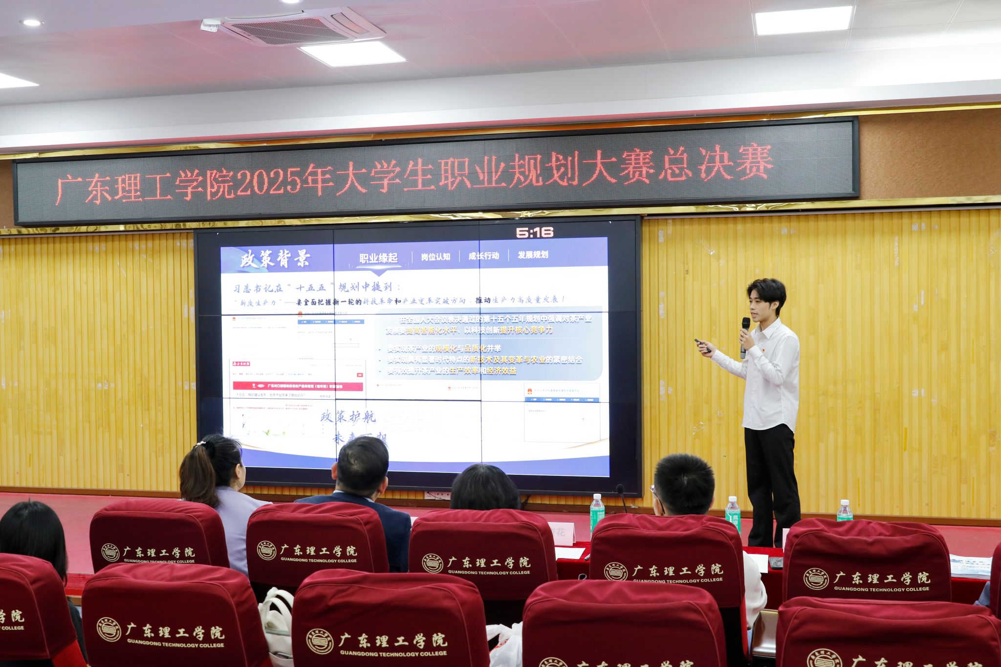 比赛环节紧凑而富有张力。入围选手们依次登台,围绕个人职业目标、实践成果与发展路径进行了精彩的主题陈述与路演展示。他们或慷慨激昂,或沉着冷静,充分展现了广理学子清晰的职业规划、扎实的专业素养和积极的未来展望。
