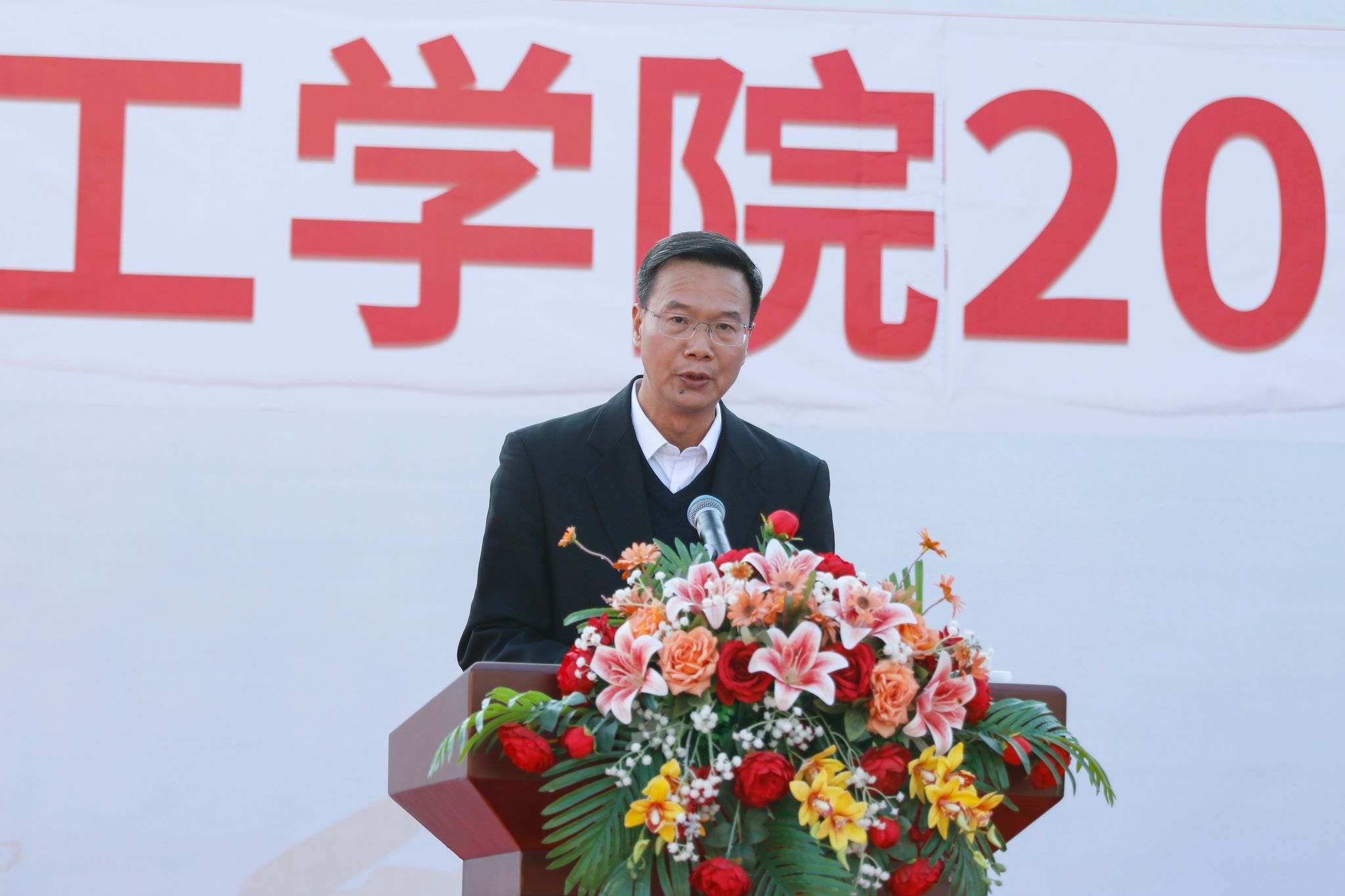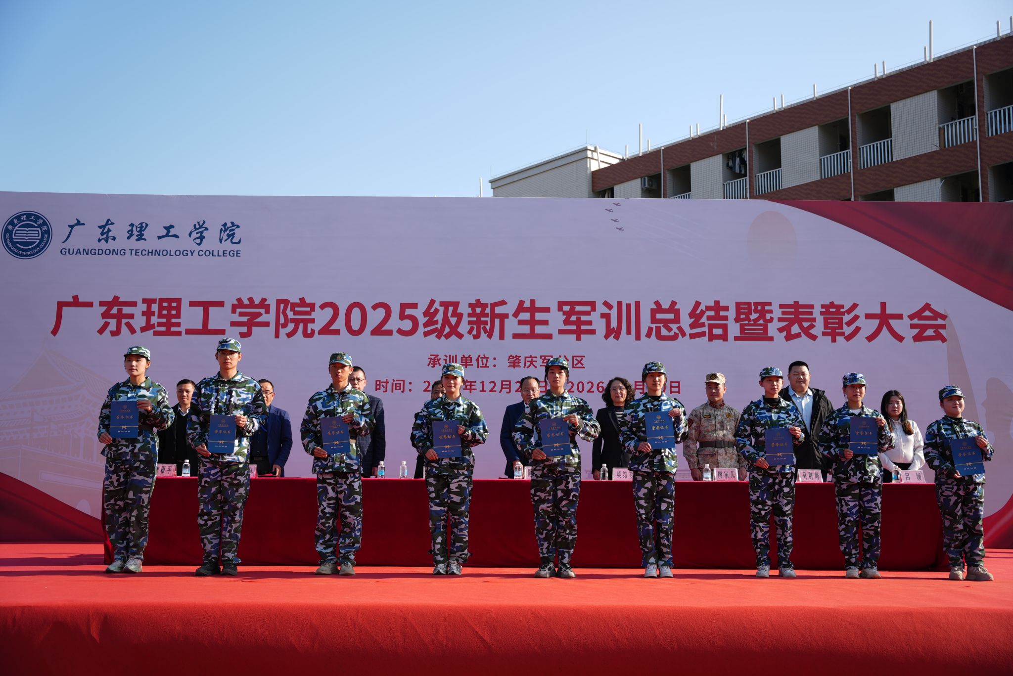 校党委副书记张宗珊、副校长谭锦兴分别宣读《关于表彰2025级学生军训优秀教官、先进集体和先进个人的决定》。参会领导为获奖代表颁奖。29名教官获评“军训优秀教官”,2025级本科机器人工程2班等20个班级荣获“军训先进集体”称号,354名同学被授予“军训先进个人”称号,20名同志获评“2025年度征兵工作先进个人”称号;智能制造学院、信息技术学院、会计学院获“2025年度征兵工作先进集体”称号,学校对以上先进集体与个人予以通报表彰。校党委书记胡海建代表学校向肇庆军分区赠送锦旗致谢。