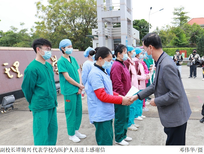 党委副书记张宗珊、副校长谭锦兴带领各相关部门负责人多次深入核酸检测点视察现场情况;关心慰问工作人员;代表学校为奋战在一线的医护人员送上鲜花,致以敬意。