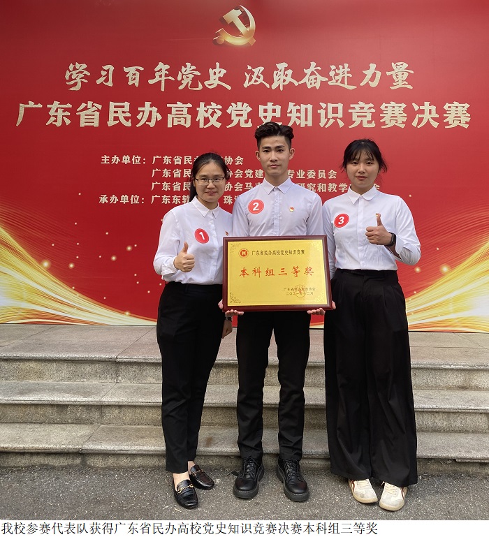 为充分展示我省民办高校党史学习教育的阶段性成果,进一步激发广大师生持续参加党史学习教育的热情,广东省民办教育协会举办了广东省民办高校党史知识竞赛,竞赛分为学习、预赛、复赛和决赛四个阶段,采用限时网上答题和现场答题相结合的方式进行。经复赛,全省民办高校共8支本科代表队伍入围决赛。beat365官网代表队由领队黎钻仪老师,智能制造学院林婉仪同学和经济管理学院梁稳泰同学组成。他们在备战党史知识竞赛中认真学习、学深悟透,在决赛中沉着应战、团结协作,最终载誉而归。