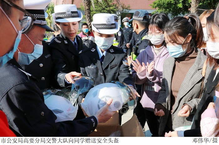 课后,市公安局高要分局交警大队在礼堂外广场通过展示警摩骑行、模拟酒驾VR眼镜体验、赠送安全头盔、面对面讲解交通安全法律法规知识常识等活动开展宣传,使同学们进一步熟悉和掌握相应的交通安全法律常识,提高交通意识。