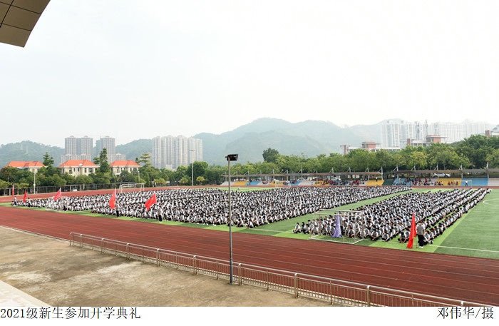 本网讯(校报记者 张鹿鸣/钟思莹) 金秋九月,丹桂飘香,又是一年开学时。9月13日上午,高要校区2021级新生开学典礼在田径运动场隆重举行,大会由党委副书记张宗珊主持,校长张湘伟、副校长谭锦兴、校长助理唐建宁以及各院系领导出席,新生辅导员和2021级新生参加。