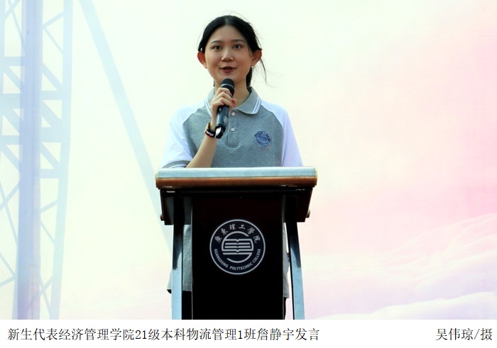 经济管理学院21级本科物流管理1班詹静宇作为新生代表发言。她提到,大学是新起点,是成就梦想的地方。同学们在学校不仅要学会照顾和接纳自己,提高交际能力,与同学们友好相处,还要树立远大的奋斗目标,认真学习学科专业知识,努力把自己塑造成为一名德智体美劳全面发展的社会主义建设者和接班人。