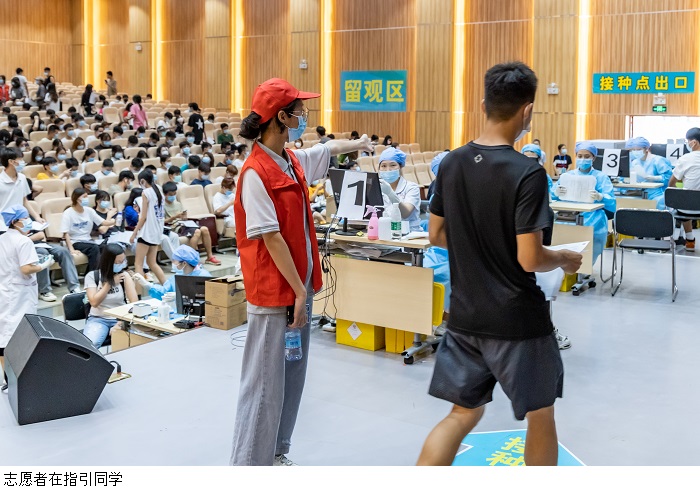 接种现场,师生佩戴口罩,在志愿者的引导下有序进行体温测量、医疗人员咨询、身份信息登记等流程。医护人员身穿防护服,高强度工作十几个小时,只为做好疫苗接种工作,全力保障新冠肺炎疫苗接种工作的顺利开展,确保疫苗接种规范、安全,构筑好校园免疫屏障。