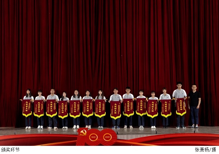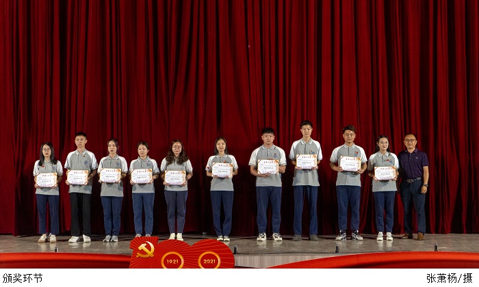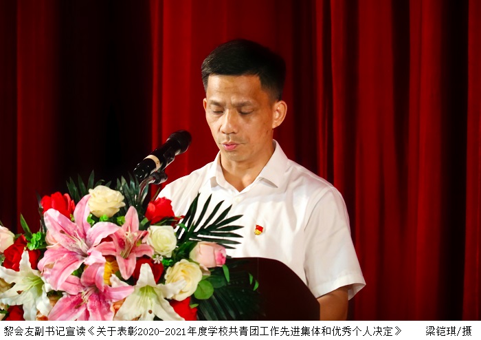 黎会友副书记宣读《关于表彰2020-2021年度学校共青团工作先进集体和优秀个人的决定》。领导们分别为2020-2021年度优秀共青团员、优秀共青团干部、先进团支部、十佳团支部书记、十佳共青团集体、五四灯塔引领之星、五四红旗团委;肇庆市优秀学生骨干、优秀共青团员、优秀共青团干部、优秀学生会、五四红旗团(总)支、五四红旗团委;广东省优秀学生骨干、优秀学生会颁奖。