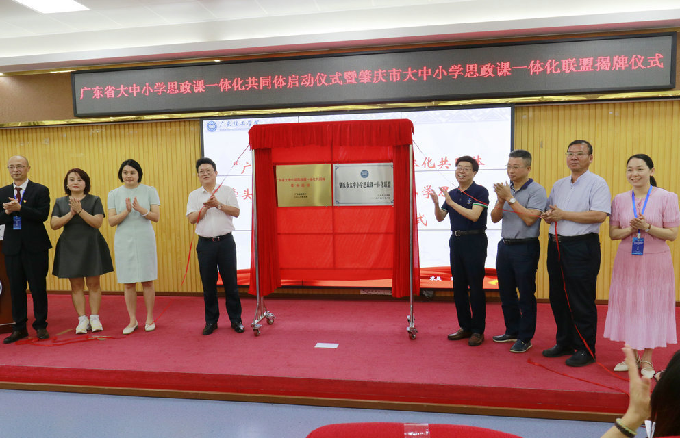 与会嘉宾为“广东省大中小学思政课一体化共同体牵头高校”暨“肇庆市大中小学思政课一体化联盟”揭牌。“广东省大中小学思政课一体化共同体项目单位”和“肇庆市大中小学思政课一体化联盟单位”代表相继接受授牌。