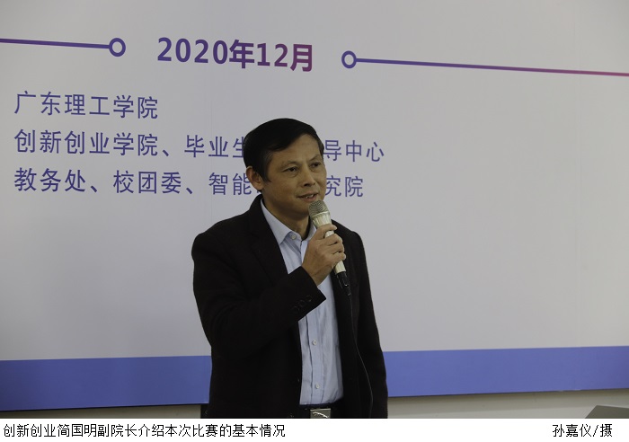 创新创业学院简国明副院长发表致辞。简副院长介绍了本次比赛的基本情况,并祝愿参赛选手赛出风格、赛出水平,展现广理学子追求卓越的精神风貌。他在致辞中殷切嘱托同学们根据学校办学特色和个人意愿树立目标,规划好学业及职业,在认真学习专业知识的同时积极参加创新创业活动和学科竞赛,提高综合素质。