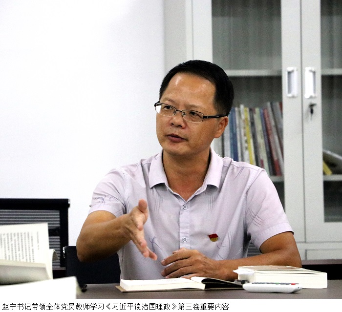 赵宁书记带领全体党员教师学习《习近平谈治国理政》第三卷重要内容。赵书记从人才、教育、经济、法制等多个角度,全面深入地梳理、分析了《习近平谈治国理政》第三卷的战略观点和重要论述。《习近平谈治国理政》第三卷不断推动广大党员学懂、弄通、做实习近平新时代中国特色社会主义思想,促进党员深入贯彻掌握马克思主义立场观点方法,增强“四个意识”、坚定“四个自信”、做到“两个维护”。赵宁书记谈及,习近平新时代中国特色社会主义思想是新时代中代中国马克思主义、21世纪马克思主义,是中国共产党的思想旗帜,是国家政治生活的根本指针,是实现中华民族伟大复兴的行动指南。