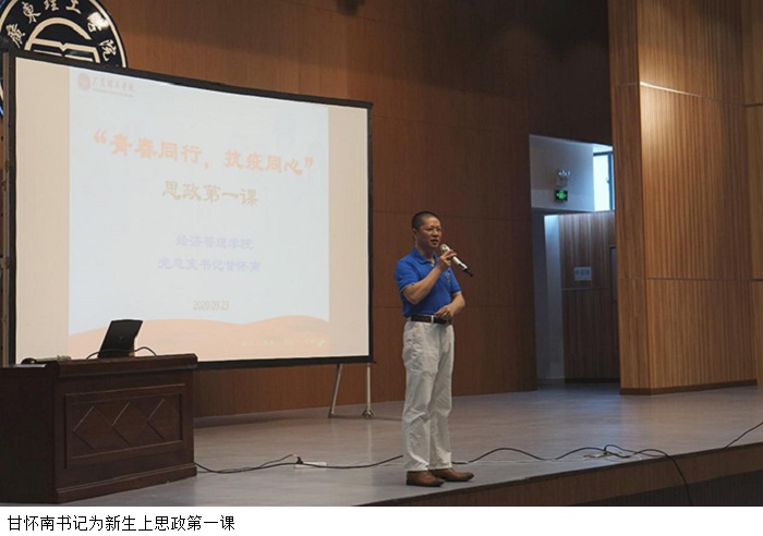 本网讯(经济管理学院)为深入学习贯彻习近平总书记关于常态化疫情防控工作的重要指示,树立新生正确的价值观和人生观,9月24日,经济管理学院季六祥院长、党总支甘怀南书记、党总支吴楚升副书记为我院2020级本科新生讲授了“思政第一课”。