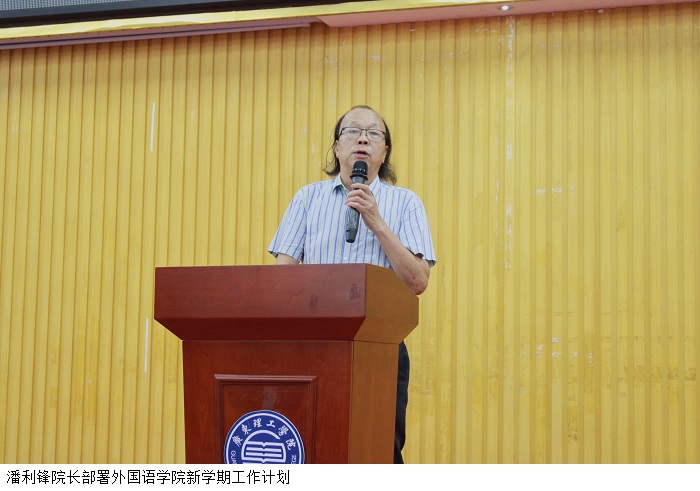 潘利锋院长代表外国语学院全体师生对新入职的老师表示热烈欢迎。随后,潘利锋院长根据前期线上教学工作的总结、本学期及以后的安排作讲话。潘院长希望教师们及时调整状态,以良好的精神面貌开展新学期的教学工作。教师们应根据课程内容安排教学任务,专心备课,吸收教学经验, 认真完成教学任务。符合学科科研职称评定条件的教师应积极参加职称评定,提升自我。论文指导教师要落实学生实习情况,督促学生完成实习任务。
