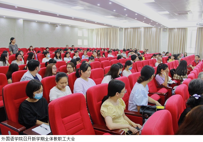 本网讯(外国语学院)为总结上学期的教学工作,更好地提升教学质量,保证教学运行效果。9月8日下午,外国语学院42101会议室召开了新学期全体教职工大会。本次会议由外国语学院党总支李永青书记主持,外国语学院院长潘利锋教授、郑建蓉副院长以及全体教职工参会。