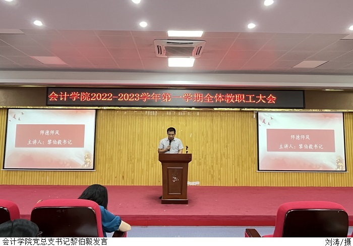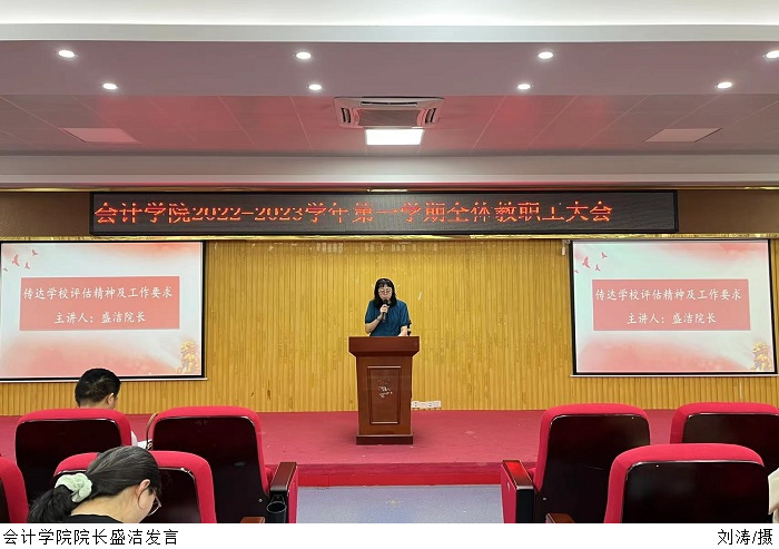 本网讯(会计学院 黄琳琳)9月13日,会计学院在高要校区42101召开以“迎接合格评估,树立师德师风”为主题的2022-2023学年第一学期全体教职工大会,院长盛洁、党总支书记黎伯毅、副院长赵燕、副院长郑春晓、党总支副书记徐永明和全院教职工参加会议。徐永明副书记主持会议。