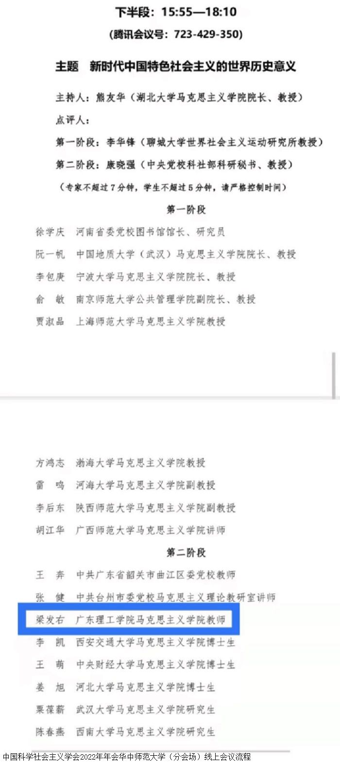本网讯(马克思主义学院)11月5日,“深入学习贯彻党的二十大精神”学术研讨会暨中国科学社会主义学会2022年年会分别在中央党校(主会场)和华中师范大学(分会场)隆重召开,beat365官网马克思主义学院梁发右老师受邀参会并以线上形式在华中师范大学(分会场)作了“中国式现代化的伦理意蕴”的主题发言,获得了与会专家的肯定与赞扬。本次受邀充分展示了beat365官网马克思主义学院教师良好的科研素养和精神风貌,是beat365官网教师学习贯彻党的二十大精神的具体体现,对于进一步提升beat365官网的学术影响力具有积极意义。