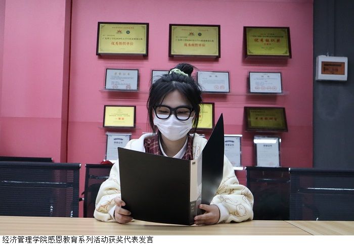 本网讯(经济管理学院 郑敏怡)为深入学习宣传贯彻党的二十大精神,推进落实立德树人根本任务,增强学生感恩意识,加强对学生知恩、感恩、报恩和施恩的人文教育和引导,经济管理学院易班学生工作站于12月7日在4栋103党员活动室举办“感恩奋进,励志成才”感恩教育系列活动的颁奖典礼。
