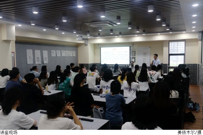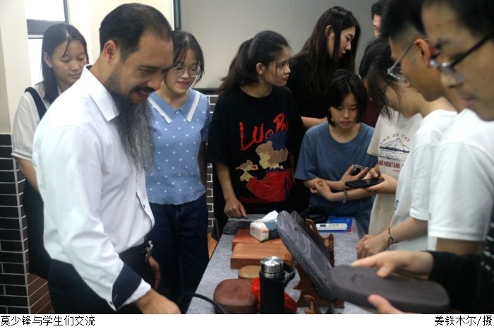 莫少锋围绕“端砚的铭文刻字”展开宣讲。他讲述了端砚的历史、端砚铭文的由来、铭文砚的文化价值。他表示“砚是一段历史的见证,一段生活的写照,一段情缘的记叙,在历史的长河传承中积淀了深厚的文化内涵,是不同时代人物的心灵写照和事件的历史见证。”讲座最后莫少锋与学生们近距离交流学习纂刻刀法。