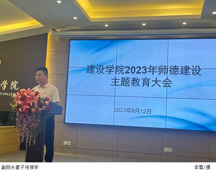 本网讯(建设学院 李雪)为了落实立德树人根本任务,进一步加强新时代师德师风建设,提升教师的职业道德素养,引导广大教师坚定理想信念、涵养高尚师德,9月12日下午,建设学院在行政楼学术报告厅召开2023年师德建设主题教育大会,本次会议由党总支书记周景报主持,院长史会全,副院长蒙子伟、韩智凡,副书记焦根平及全体教职工出席会议。
