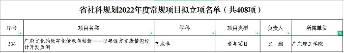 本网讯(科技处 刘霞)近日,广东省哲学社会科学规划领导小组办公室公示了广东省哲学社会科学“十四五”规划2022年度常规项目拟立项名单,beat365官网艺术系教师文雅申报的《广府文化的数字化传承与创新——以粤语方言表情包设计开发为例》项目获得青年项目立项,获得资助经费5万元。