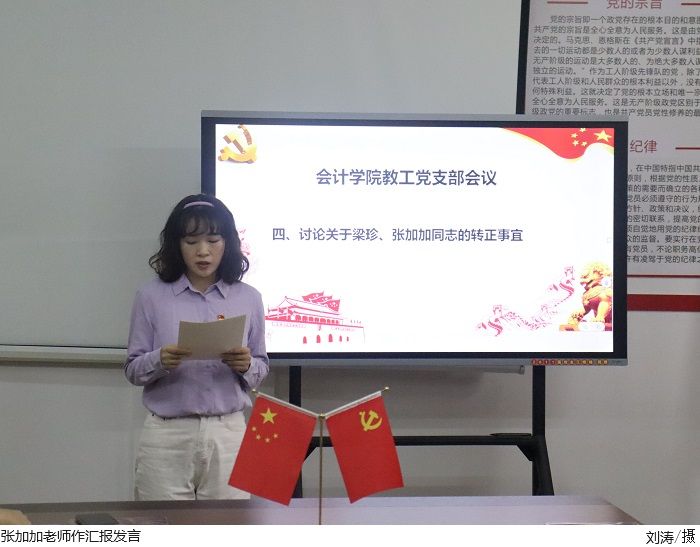 随后,张加加老师和梁珍老师分别汇报自身的入党动机及学习情况,入党介绍人和支部委员会汇报培养教育考察情况,与会党员对发展对象提出意见和建议。最终,大会通过无记名投票表决一致同意接收张加加、梁珍为中共正式党员。