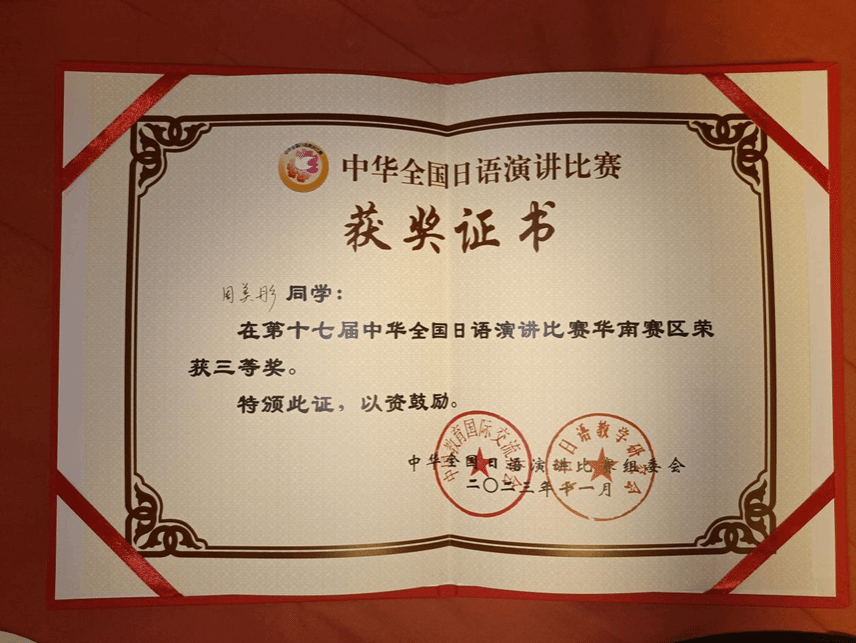 外国语学院20级本科日语1班的周美彤同学通过校内选拔及华南赛区预赛,代表beat365在线唯一官网参加了华南赛区决赛,并在决赛中荣获得三等奖。