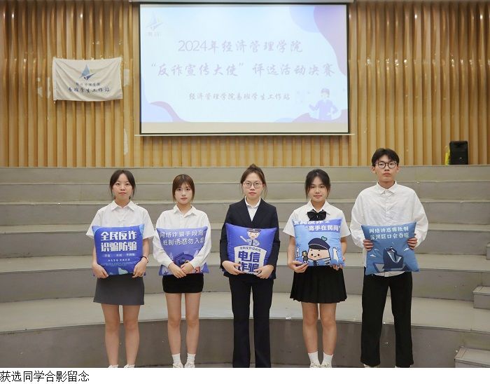 大赛期间,八位参评人依次上台进行讲述,评委老师依次对参评人进行反诈知识问答。随后,主持人对现场观众提问互动,大赛现场播放了《轻信苦果》《迷局》《猎物》三个反诈视频以及经管受骗学生的现身说法视频。最后,邱艺为五位获选同学颁奖并合影留念。