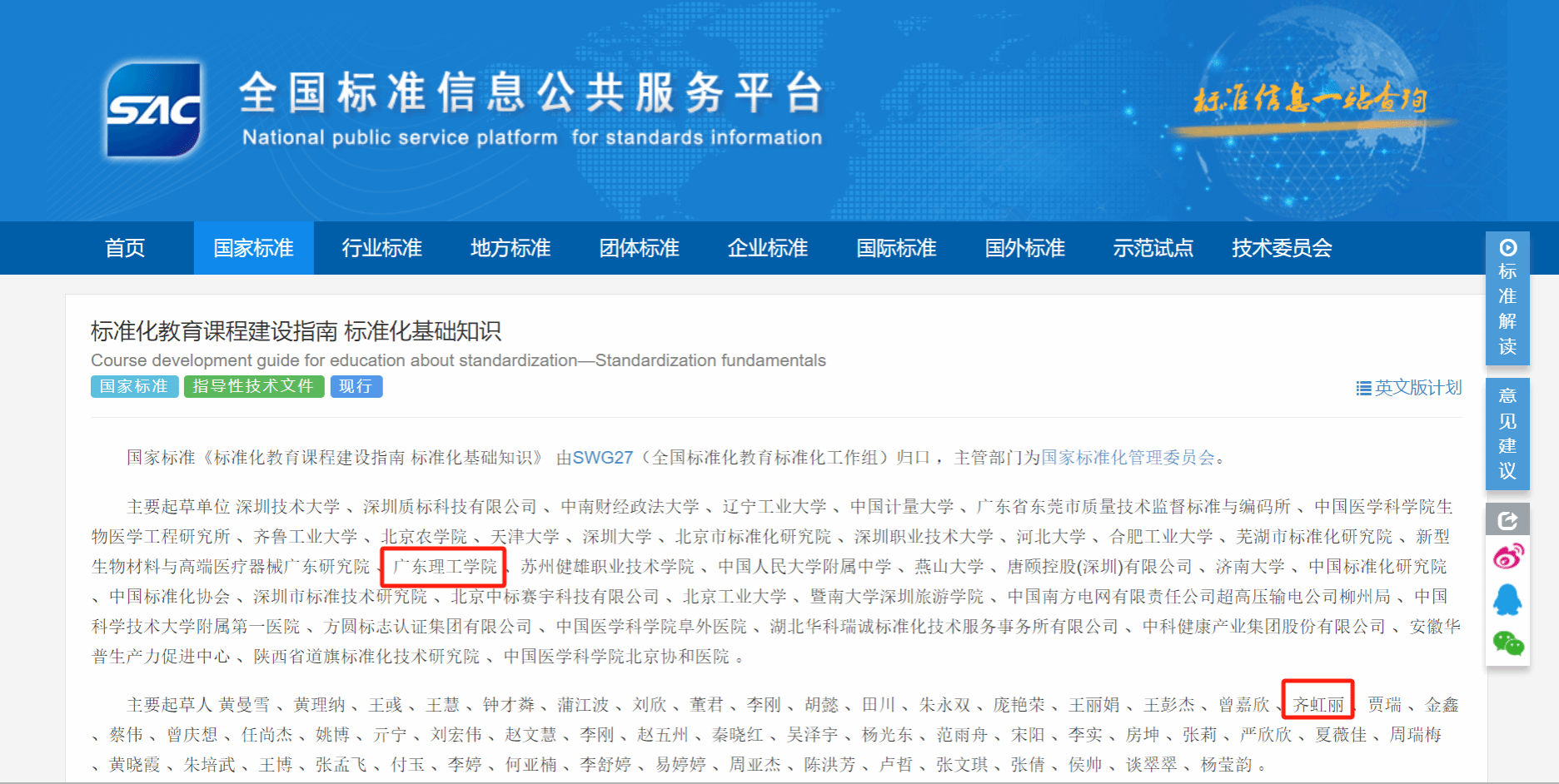本网讯(经济管理学院)2024年5月28日,国家市场监督管理总局、国家标准化管理委员会发布中华人民共和国国家标准公告(2024年第9号),经济管理学院标准化工程专业齐虹丽教授团队参与制定的GB/Z 43946-2024《标准化教育课程建设指南 标准化基础知识》正式发布,并于当日开始实施。经济管理学院为该项标准的重要起草单位。该项国家标准的颁布将为我国标准化教育课程更大范围的开设起到重要的推动作用。