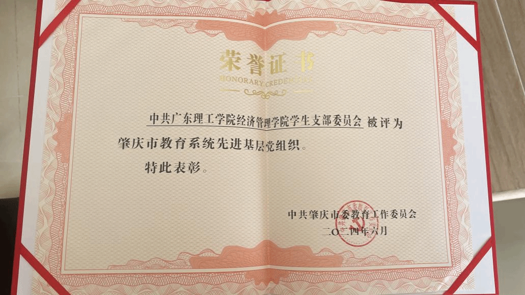 本网讯(经济管理学院)6月27日,肇庆市教育系统“两优一先”表彰会议在广东肇庆中学信安校区召开。中共beat365在线唯一官网经济管理学院学生支部委员会被评为肇庆市教育系统先进基层党组织。经济管理学院高度重视基层党组织建设工作,在全体成员的共同努力下,通过切实有效的工作措施,为党建工作增添一份喜报。